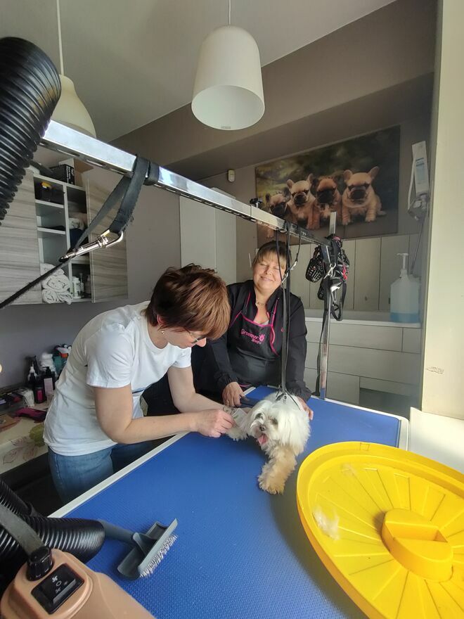 Część teoretyczna i praktyczna w profesjonalnym salonie groomerskim.