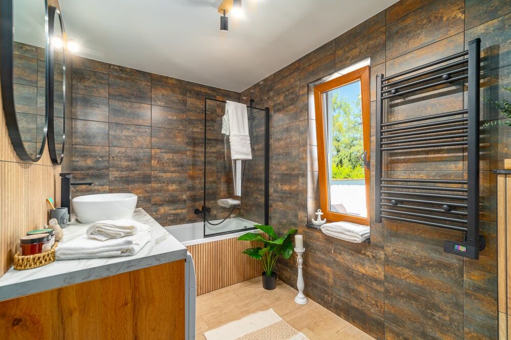 Wnętrza łączą nowoczesność z drewnem i ciepłymi akcentami. Jasna kuchnia z pełnym AGD, łazienka z oknem i stylową armaturą, wygodne sypialnie – wszystko z dbałością o detal, by Ty (lub goście) czuli się jak w apartamencie.