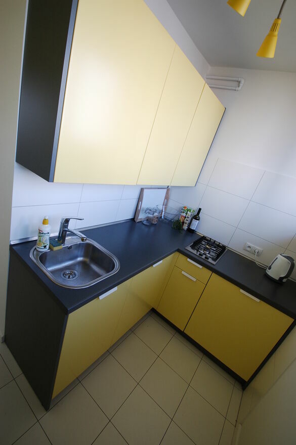 -Wydzielona kuchnia. Wyposażenie: zlew, płyta grzewcza, lodówka podblatowa z zamrażarką, pralka w zabudowie, szafki do przechowywania.