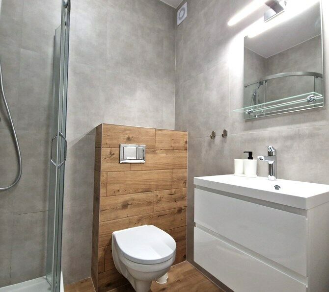 Łazienka razem z WC: kabina prysznicowa, pralka, umywalka, szafka,