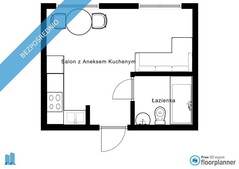 Układ: pokój z aneksem kuchennym, łazienka z WC