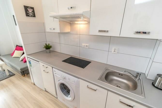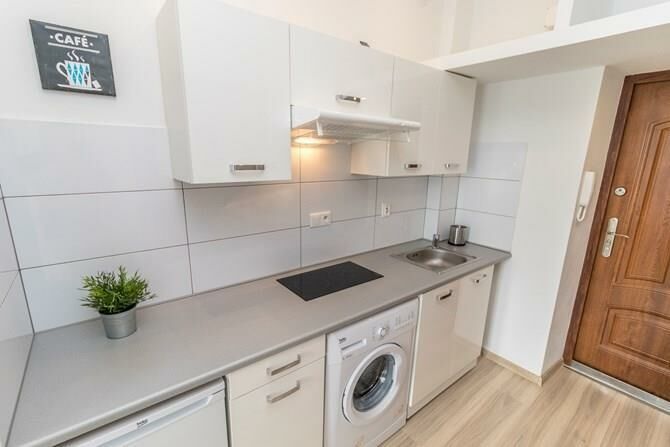 Aneks kuchenny: lodówka, pralka, zlewozmywak, płyta grzewcza, okap,