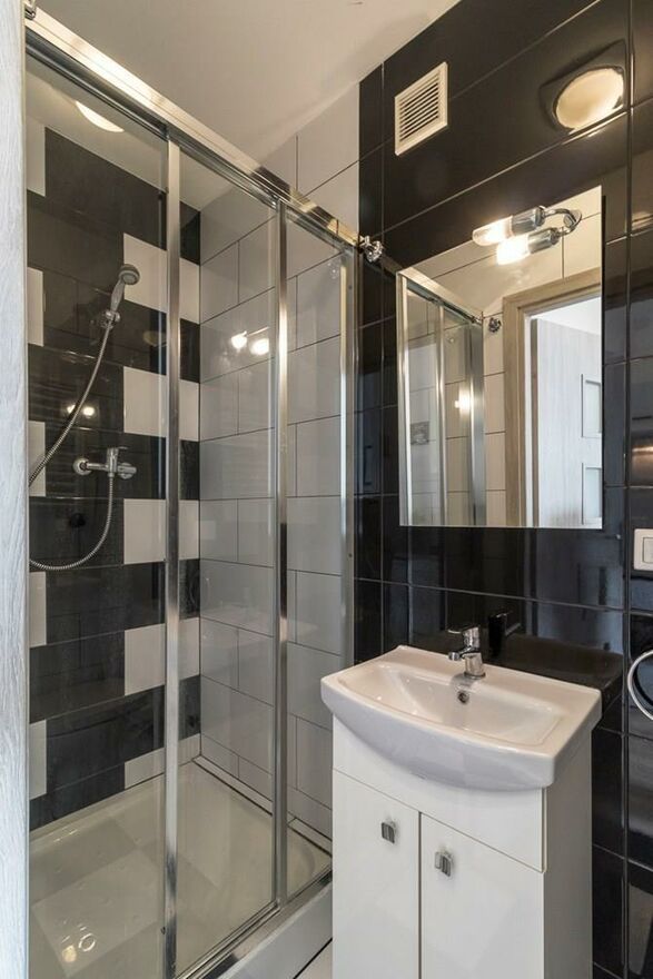 Łazienka: prysznic, umywalka, WC.