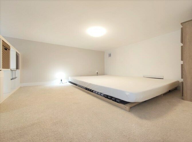 Antresola: materac na stelażu, komoda, półki stojące, lampka
