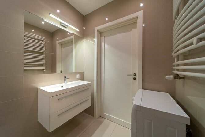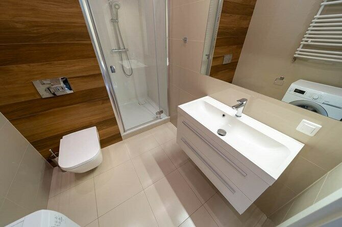 Łazienka połączona z WC: kabina prysznicowa, pralka, umywalka z