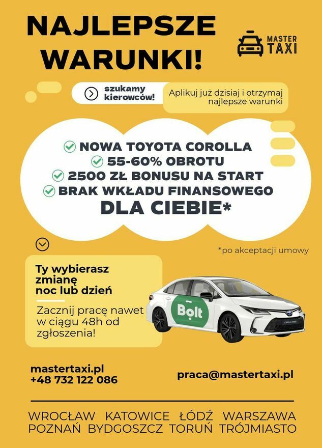 Cześć!Szukasz stabilnej pracy jako Kierowca Taxi Bolt/Uber z elastycznym grafikiem i świetnymi zarobkami? A może chcesz dorobić w wolnym czasie?