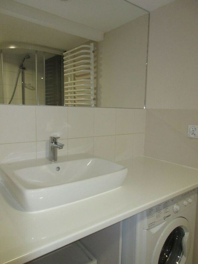 Łazienka: kabina prysznicowa, WC, umywalka, lustro, pralka.