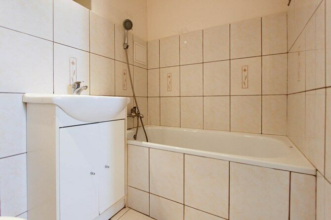 Łazienka: wanna, WC, umywalka.
