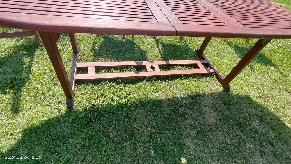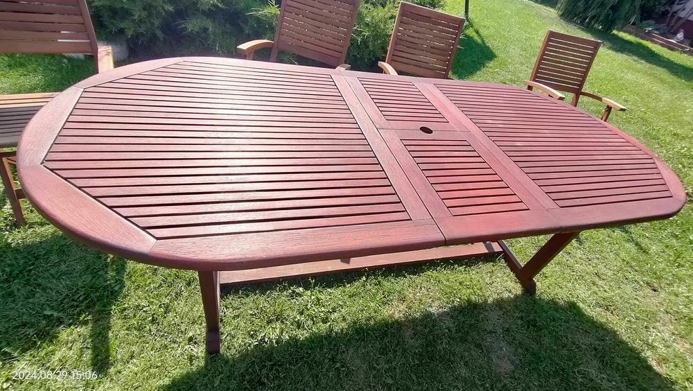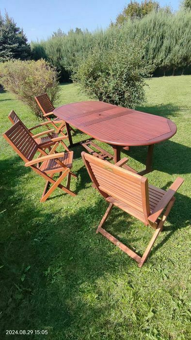 Jak ogłoszenie jest widoczne to jest aktualne !!! Duży rozkładany stół tarasowy stan b.dobry nigdzie nie uszkodzony wymiary dł.1,90 szer.98 po rozłożeniu dł.2,30. Wysokość 74. Krzesła rozkładane nigdzie nie uszkodzone.Odcien stołu trochę inny ponieważ był dodatkowo zabezpieczony..Certyfikat FSC. Mozliwy przywóz Łódź okolice.Roman