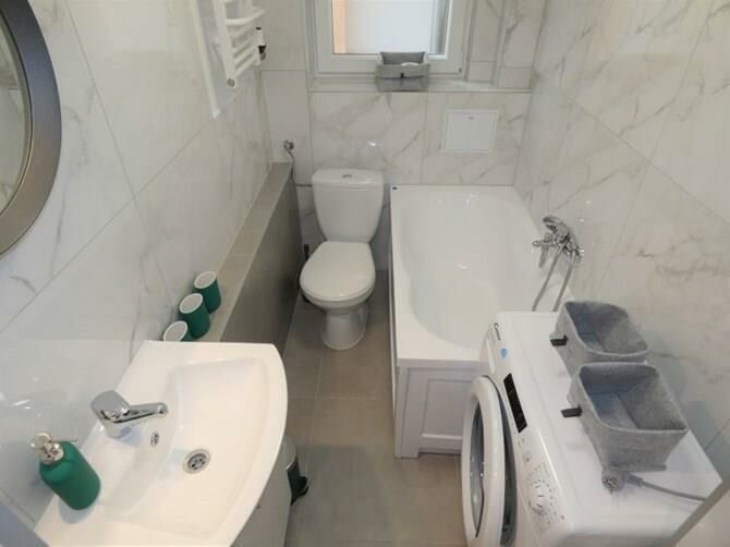 Łazienka: wanna, umywalka z szafką, lustro, WC.