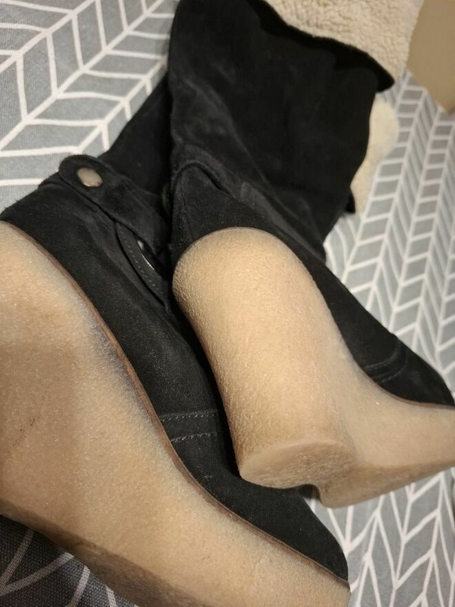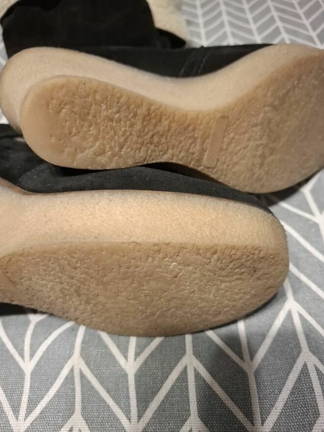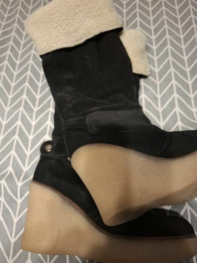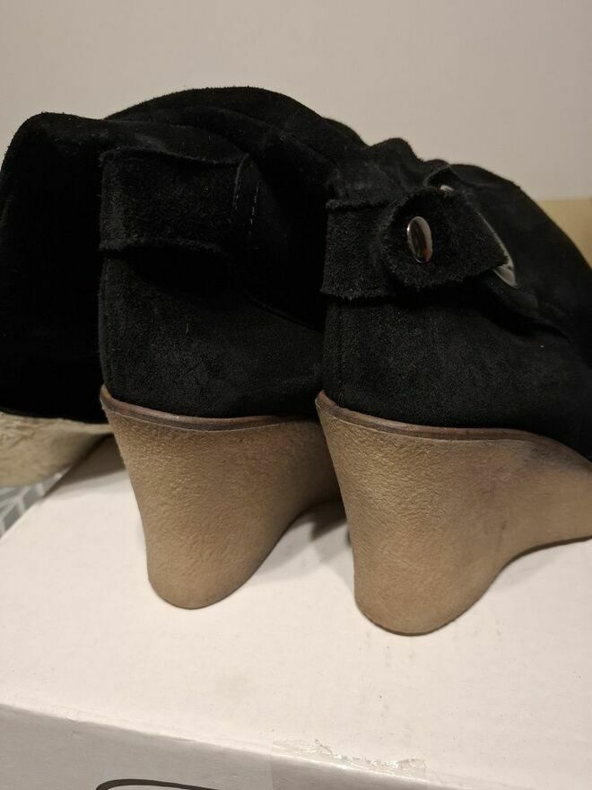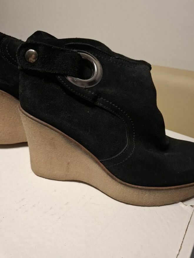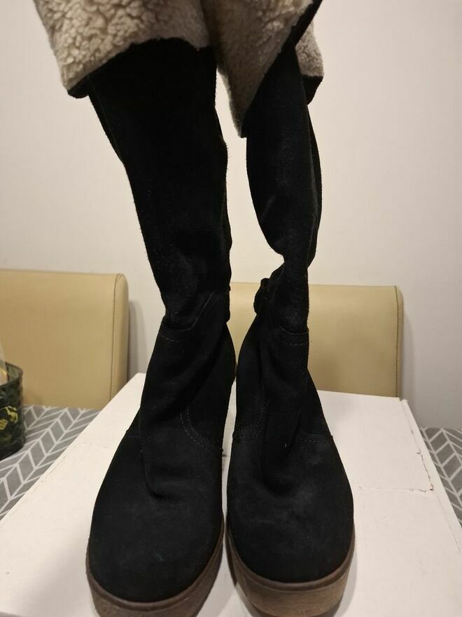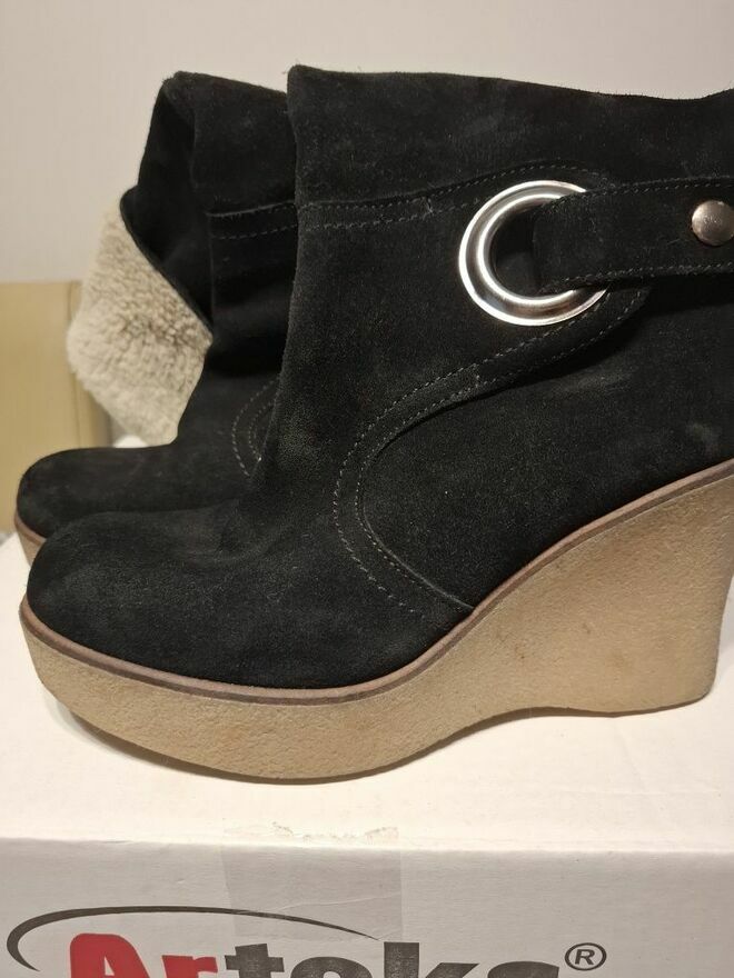 Zamszowe kozaczki na koturnie w kolorze czarnym. Wykonane z zamszu, używane. Doskonała opcja na chłodniejsze dni, zapewniające wygodę i styl. Rozmiar 36. Wysokość koturny 8 cm, pod palcami podeszwa 2,5 cm, długość cholewki 30 cm. Styl vintage. Stan bdb. ZapraszamBarbara