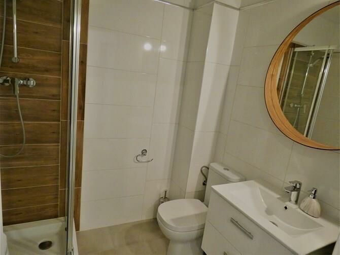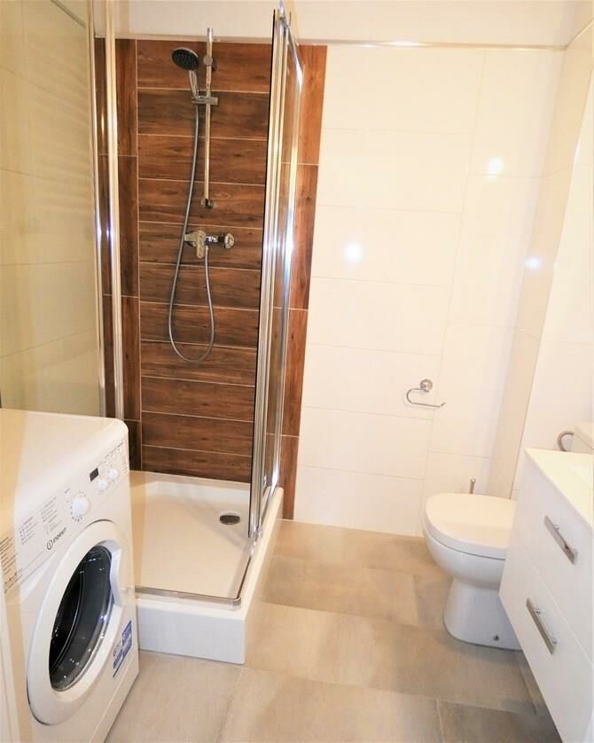 Łazienka z WC: pralka, kabina prysznicowa, umywalka z szafką oraz