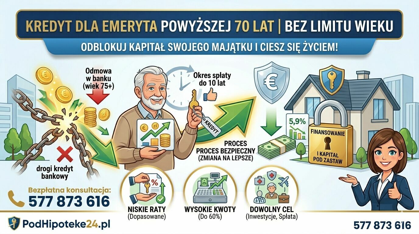 Masz powyżej 70 lat, stałą emeryturę i własną nieruchomość, ale bank odmówił Ci kredytu? To częsty problem – banki stosują restrykcyjne limity wiekowe (zazwyczaj do 75. roku życia przy spłacie ostatniej raty), co dla seniora oznacza ofertę na bardzo niską kwotę i krótki czas.W PodHipoteke24.pl wiemy, że Twoja nieruchomość ma wartość bez względu na Twój wiek! Oferujemy bezpieczne pożyczki pod zastaw nieruchomości, gdzie wiek nie jest przeszkodą.