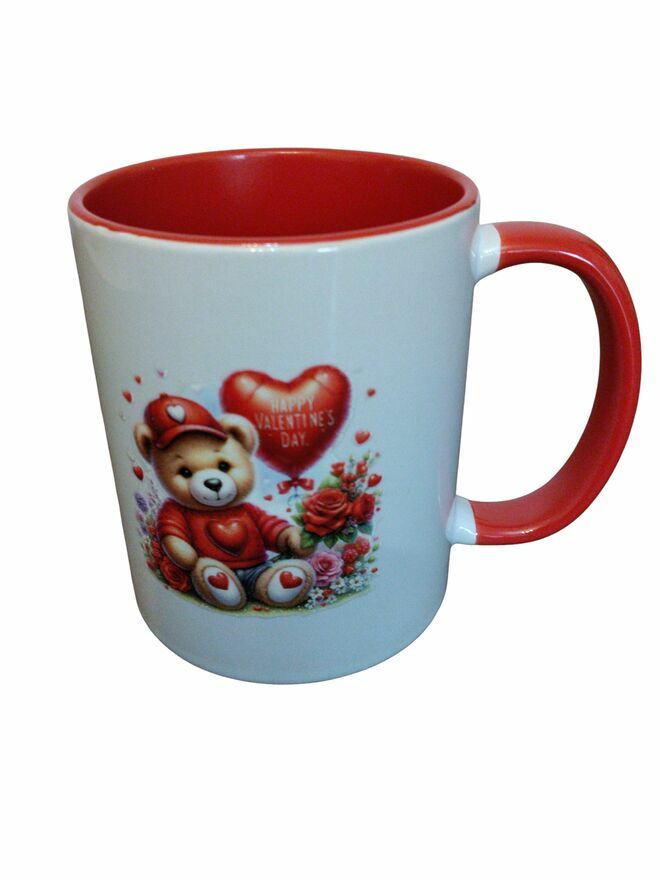 Elegancki kubek ceramiczny z motywem misia z serduszkami i kwiatami z czerwonym wnętrzem i uszkiem,idealny na Walentynki dla bliskiej osoby, można normalnie zmywać i także w zmywarce do 45 stopni polecam.Grzegorz