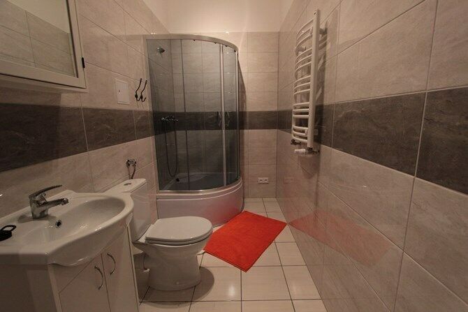 Łazienki (2): szafki na kosmetyki, kabina prysznicowa, WC, umywalka,