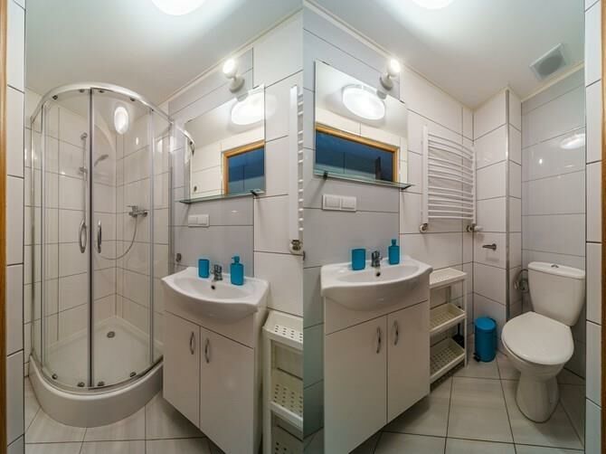 Łazienka: kabina prysznicowa, WC, umywalka.