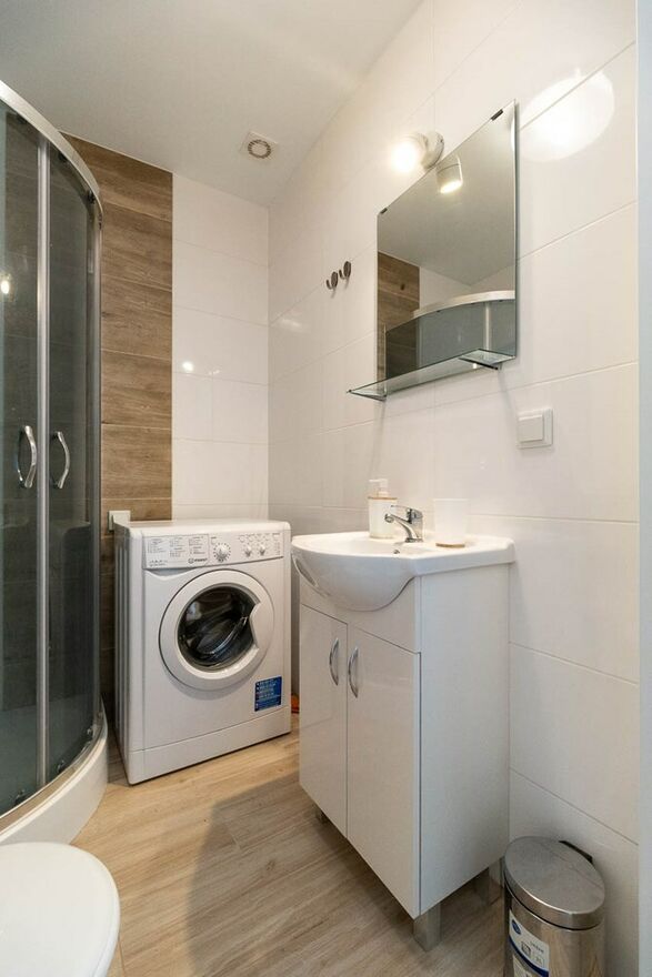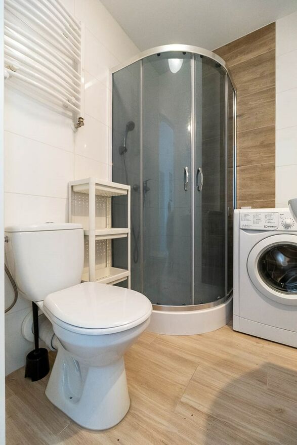 Łazienka: WC, kabina prysznicowa, umywalka, pralka.