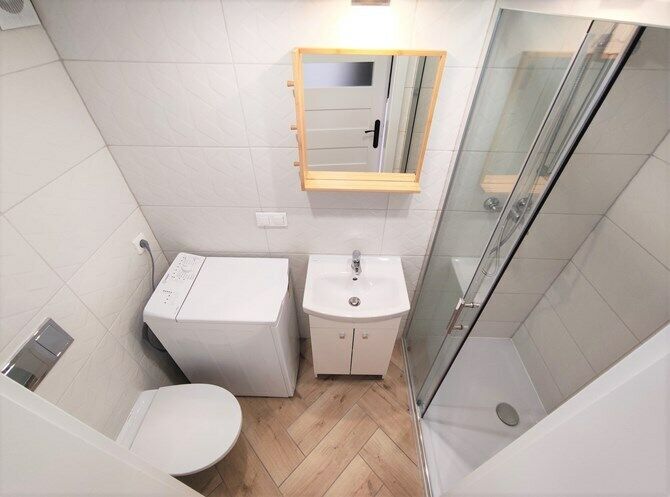 Łazienka: kabina prysznicowa, pralka, WC, umywalka, szafka, lustro.