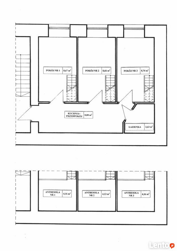 - pokój nr 1: 12,8 m2 (w tym antresola 4,1 m2);