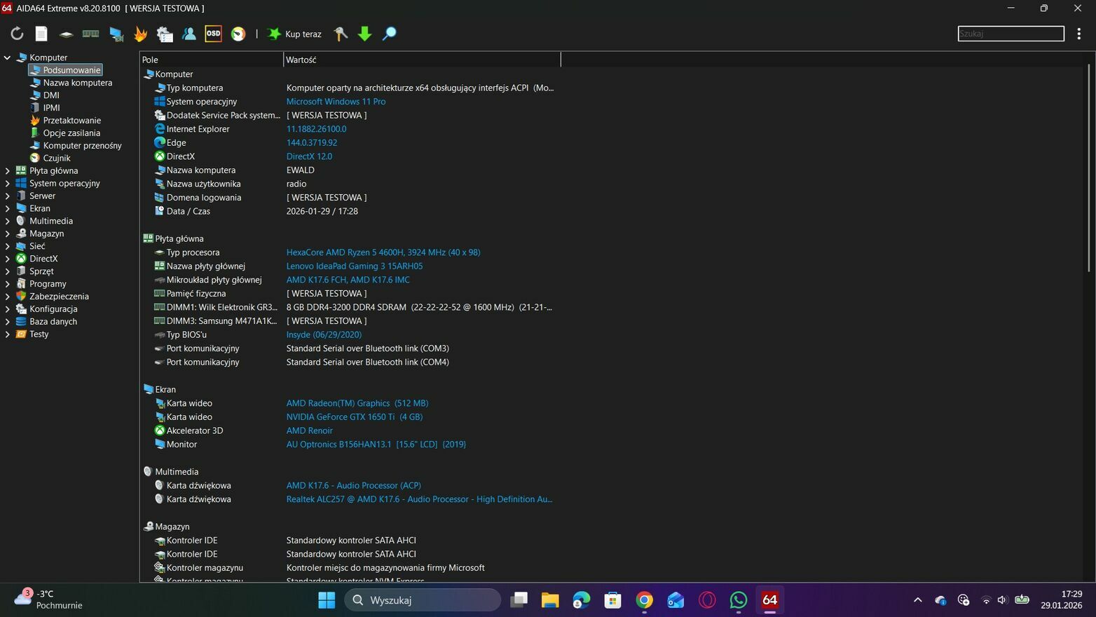 Ogłoszenie wstawiam właśnie z tego laptopa. Załączam PrintScreena z AIDA 64