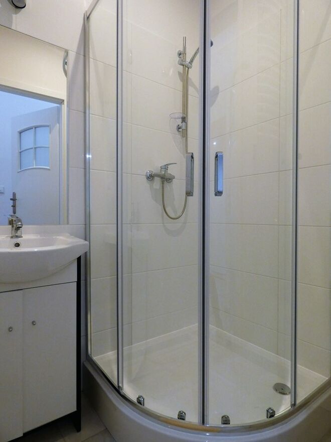 Łazienki: kabina prysznicowa, umywalka z szafką i lustrem, dodatkowe