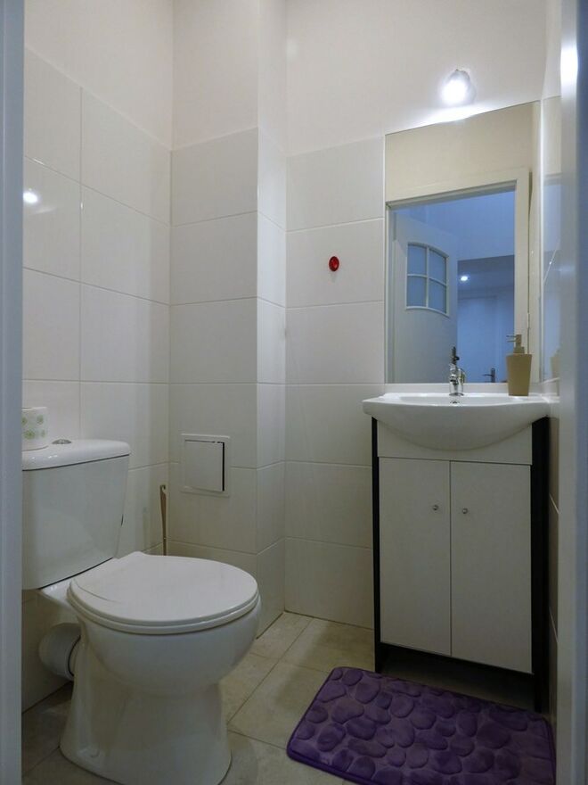 WC z umywalką i lustrem.
