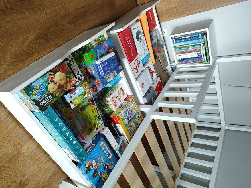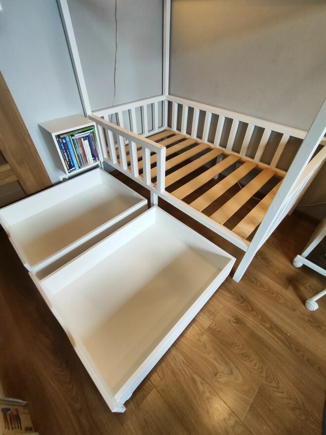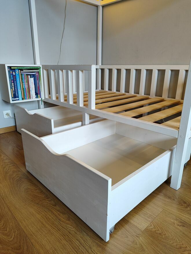 Pod łóżkiem znajdują się dwie potężne szuflady na kółkach.