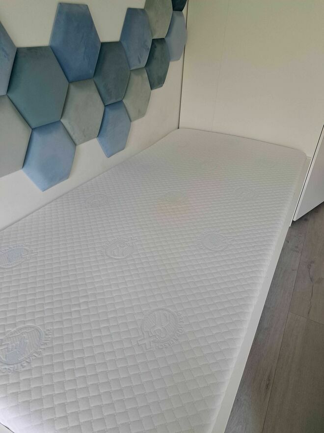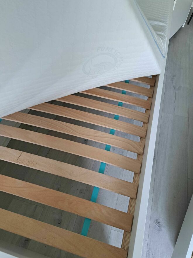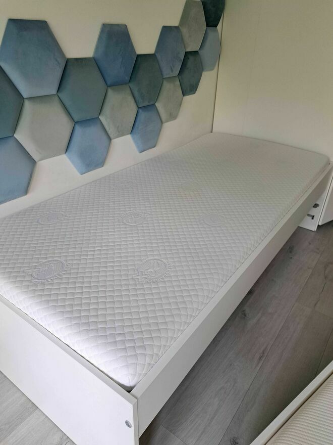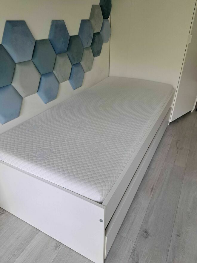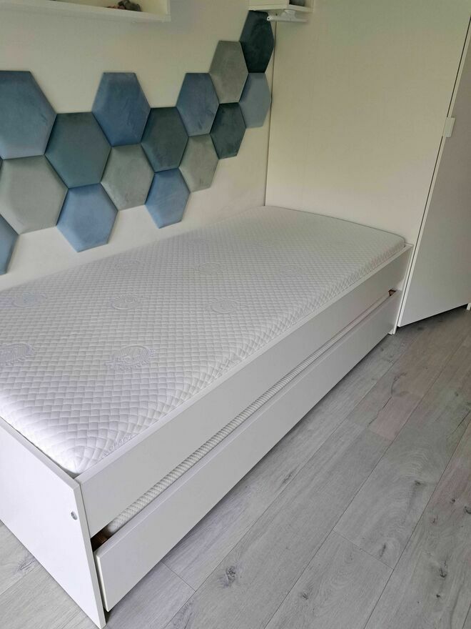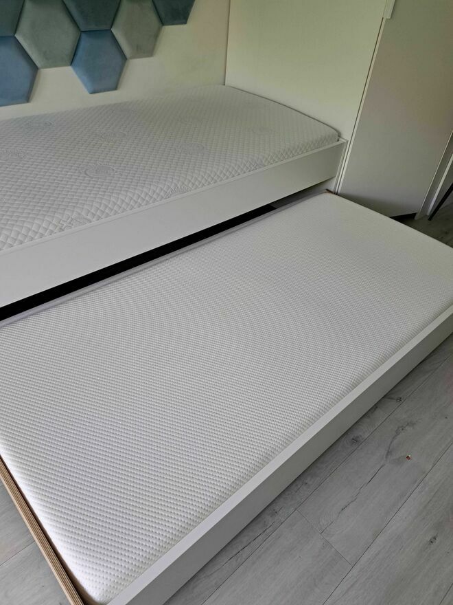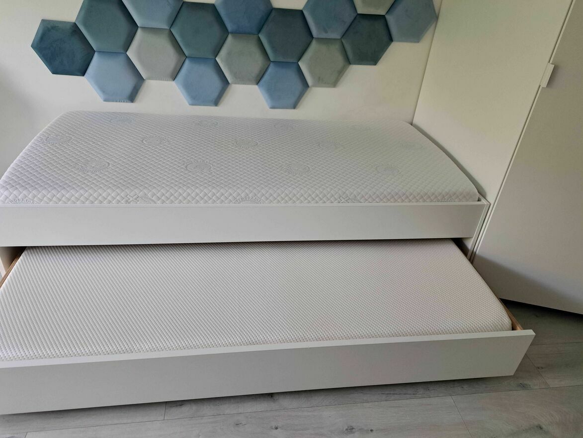 Funkcjonalne łóżko dla dwójki dzieci. Nowoczesne, z wysuwanym dolnym spaniem, idealne rozwiązanie do niewielkich pokoi. Wyposażone w elastyczne stelaże, zabezpieczenia i ciche kółka, zapewnia wygodę, trwałość i bezpieczeństwo. Dołączam 2 materace w idealnym stanie, bardzo wygodne. Dodam, że córka spała na łóżku tylko 2 lata.