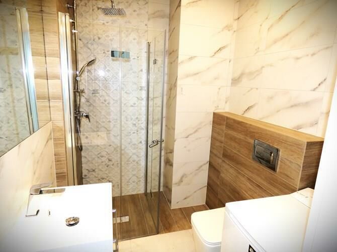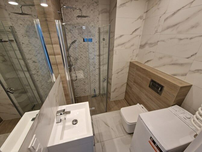 Nowoczesna kuchnia oraz łazienka.