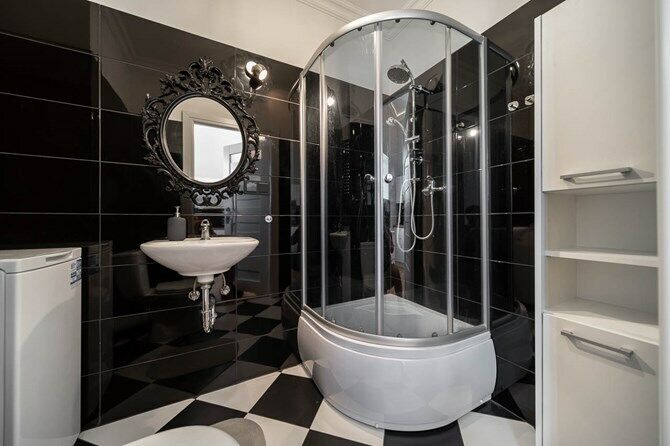 Łazienka: kabina prysznicowa z hydromasażem, pralka, szafka,