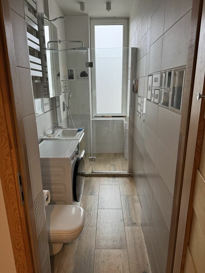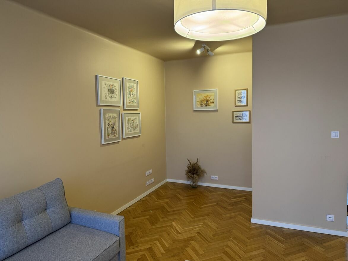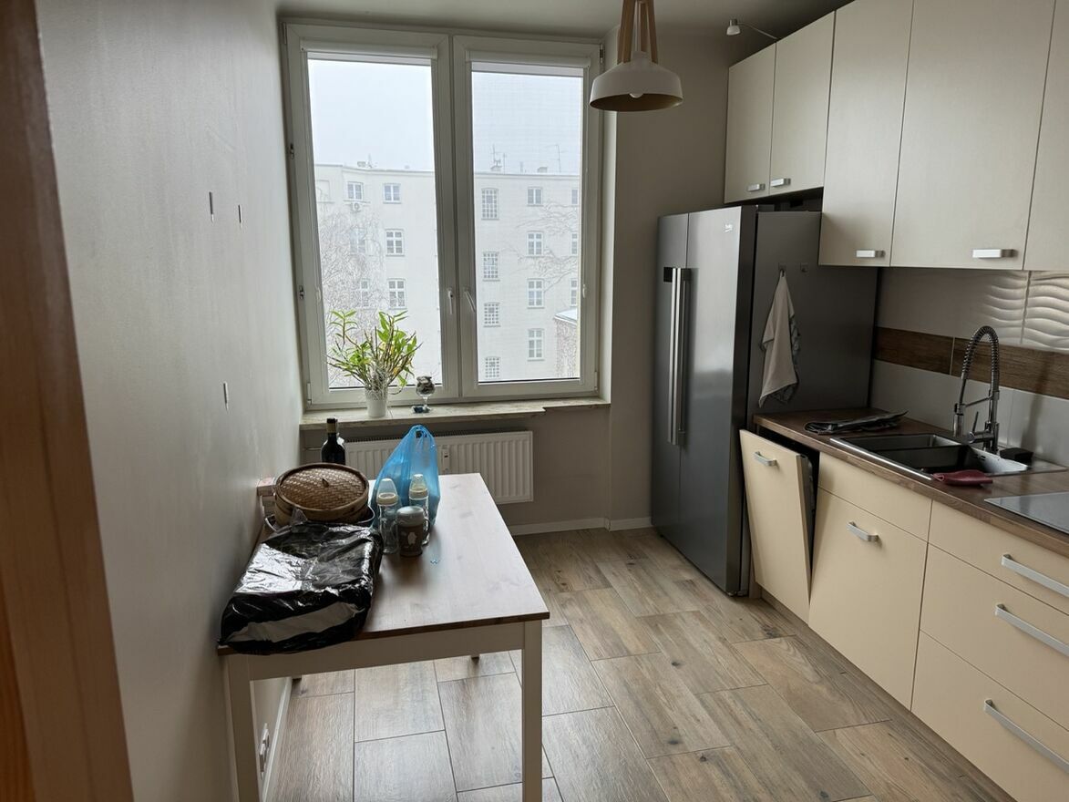 Mieszkanie na wynajem, w bloku na 3 piętrze. Blok w samym centrum miasta, osłonięty od ulic kamienicami przy samej ulicy.Mieszkanie ma 54 m2, wnętrza są jasne, generalny remont przeprowadzony w ciągu ostatnich 3 lat. Salon / pokój dzienny jest wyposażony w zabudowaną szafę, kanapę rozkładaną (po rozłożeniu powierzchnia spania to 220x140cm), stolik kawowy oraz fotel. Można dostawić własną szafkę RTV, komodę i witrynę. Jest zamontowany uchwyt pod zawieszenie TV na ścianie. Oddzielna kuchnia z płytą indukcyjną oraz lodówką SBS i zmywarką, duża ilość pojemnych szafek w zabudowie. Łazienka z prysznicem i nowoczesnym wykończeniem jest w standardzie, pralko-suszarka na wyposażeniu.