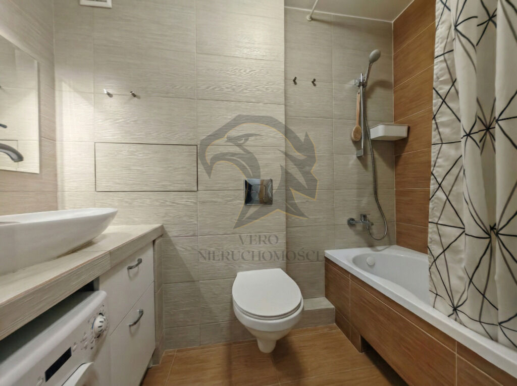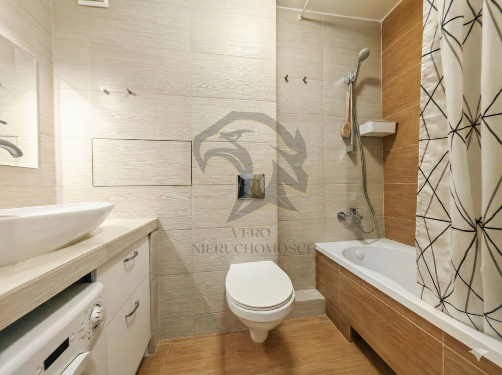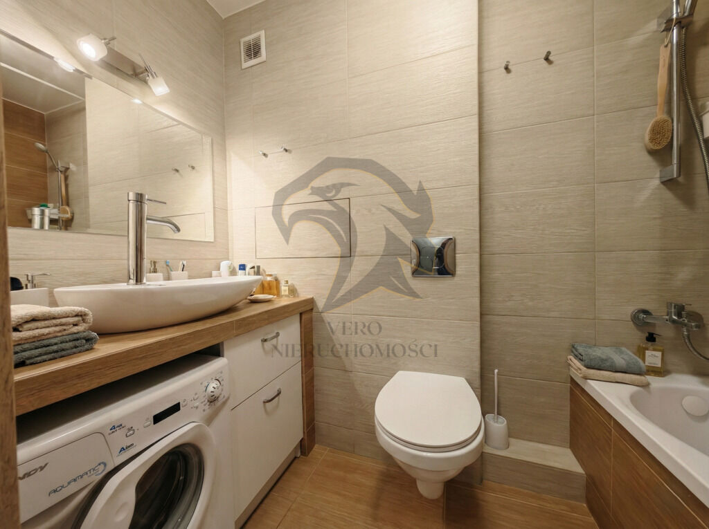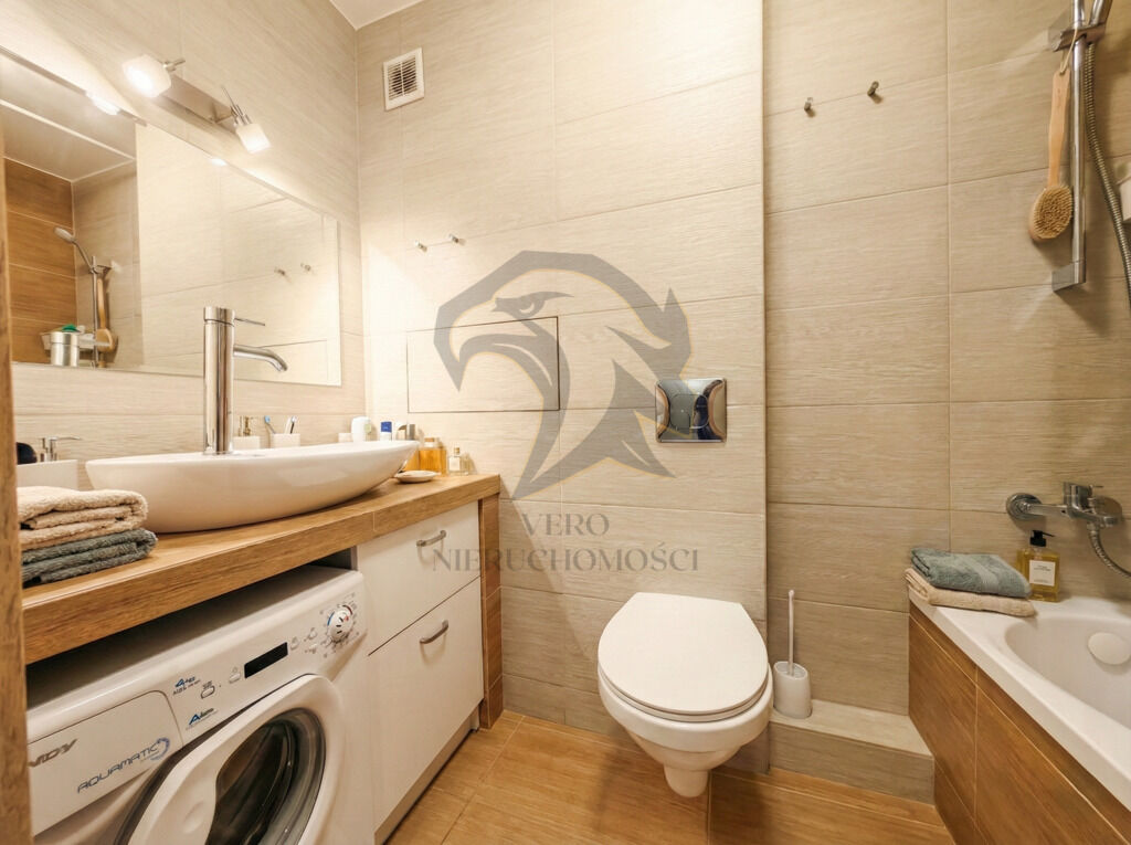 Mieszkanie z klimatyzacjąŁazienka wyposażona w pralkę i szafkę