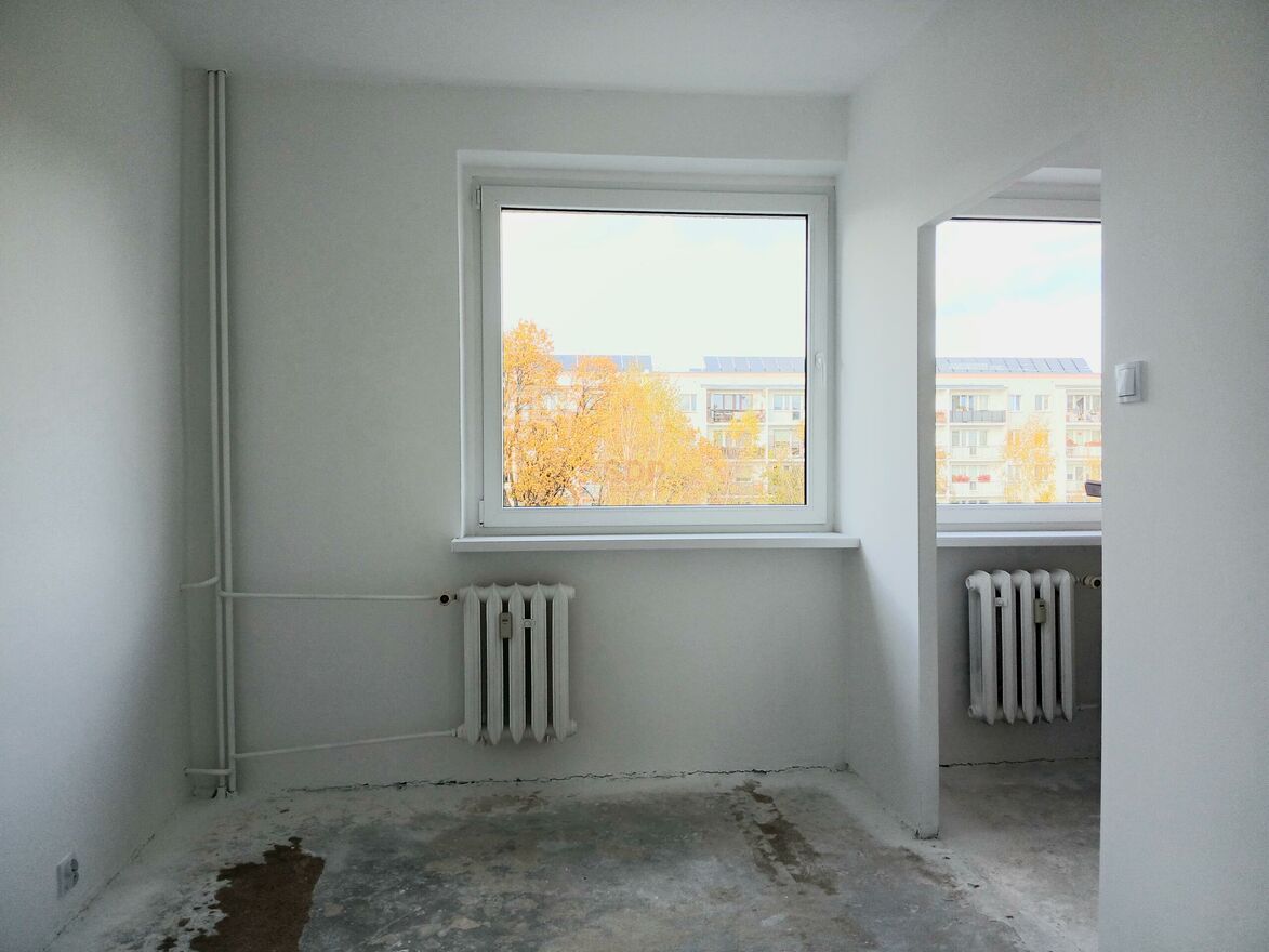 Budynek po kompleksowej termomodernizacji oraz wymianie pionów wodno-kanalizacyjnych. Mieszkanie jest w stanie do kapitalnego remontu, ale część prac już wykonano. Są zamontowane nowe drzwi wejściowe i wymienione wszystkie okna. Zerwano pokrycie wszystkich podłóg oraz zdemontowano zużyte meble kuchenne, tak więc odpada konieczność wywozu gabarytowych odpadów. Na ścianach częściowo są położone gładzie gipsowe a częściowo tynki cementowe w dobrym stanie. Wszystkie ściany zostały odmalowane na biało. Jedyne prace demontażowe pozostały do wykonania w łazience i WC, w pozostałych pomieszczeniach można od razu przystępować do aranżacji.