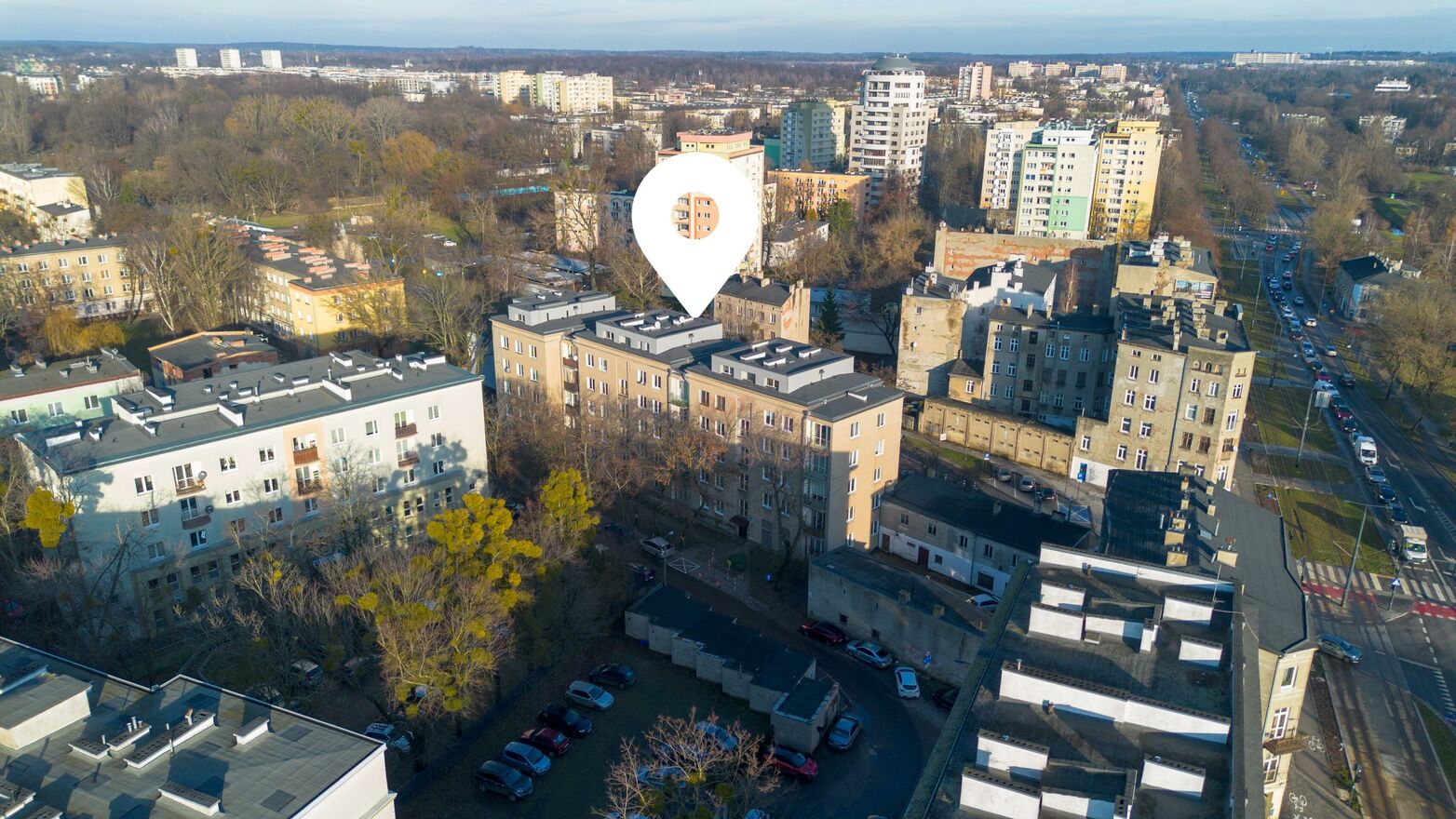 Mieszkanie znajduje się w bloku z cegły przy ul. Obrońców Westerplatte 6a. W zasięgu spaceru Park Ocalałych i Park Helenów. Nieruchomość położona jest w bardzo atrakcyjnej i zielonej okolicy, w bliskiej odległości przystanki komunikacji miejskiej, dzięki czemu można w łatwy sposób dostać się do każdej części miasta. Bardzo blisko punkty usługowe i gastronomiczne, niedaleko od ul. Piotrkowskiej i Manufaktury.