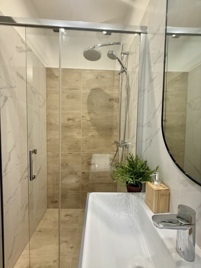 Atutem łazienki jest przestronny prysznic z deszczownicą oraz nowoczesny design z wieloma miejscami na kosmetyki.