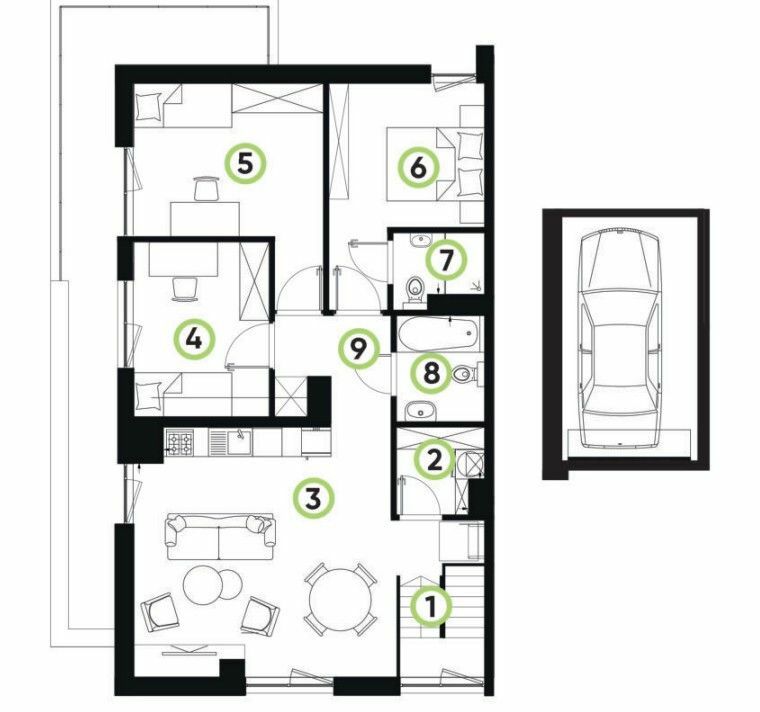 4-pokojowe mieszkanie w stanie deweloperskim znajdujące się na piętrze budynku, garaż na parterze budynku oraz miejsce postojowe. Do mieszkania przynależy niewielki ogródek.