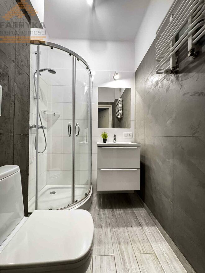 W łazience znajduje się kabina prysznicowa, umywalka z szafką oraz toaleta.