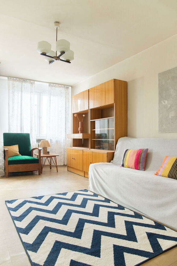 Wnętrze składa się z oddzielnej kuchni z oknem, trzech oddzielnych pokoi, łazienki i oddzielnej toalety.