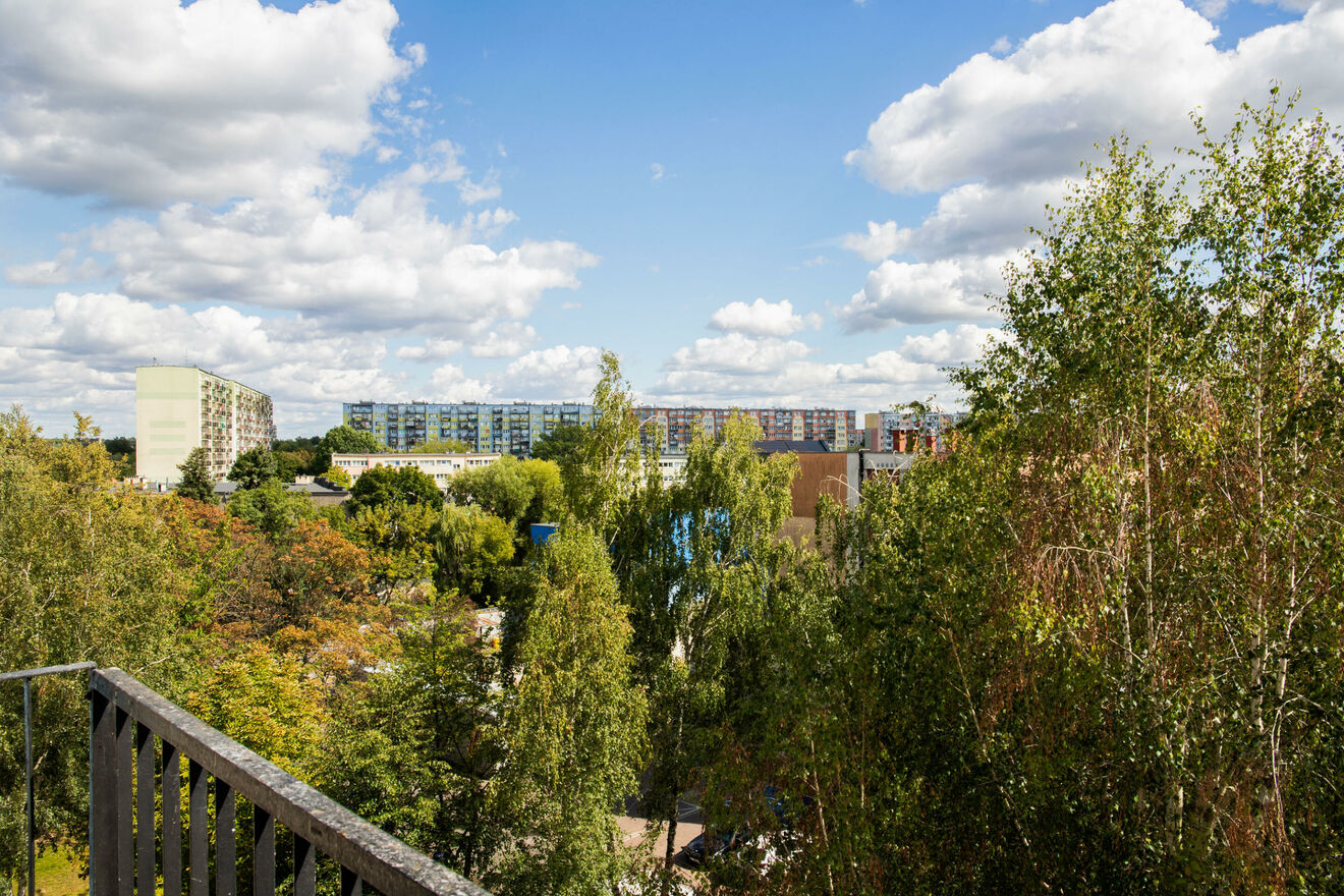 Mieszkanie znajduje się w wieżowcu, co zapewnia doskonałe widoki oraz naturalne doświetlenie pomieszczeń.