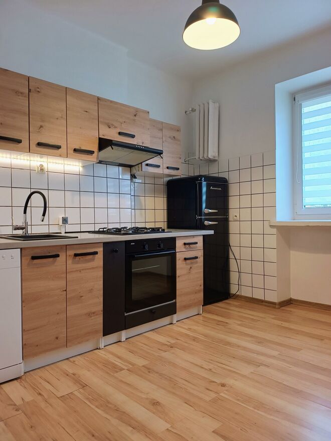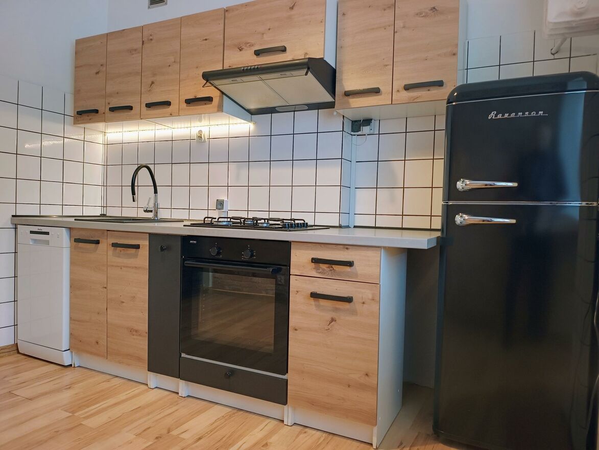 W skład mieszkania wchodzi oddzielna kuchnia, która jest w pełni wyposażona w niezbędne sprzęty, takie jak piekarnik, lodówka, pralka oraz kuchenka. Mieszkanie w sprzedaży obejmuje również meble, co ułatwia wprowadzenie się bez konieczności dodatkowych inwestycji.
