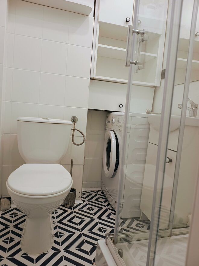 W łazience znajduje się toaleta oraz umywalka, co sprawia, że jest ona funkcjonalna i wygodna w codziennym użytkowaniu.