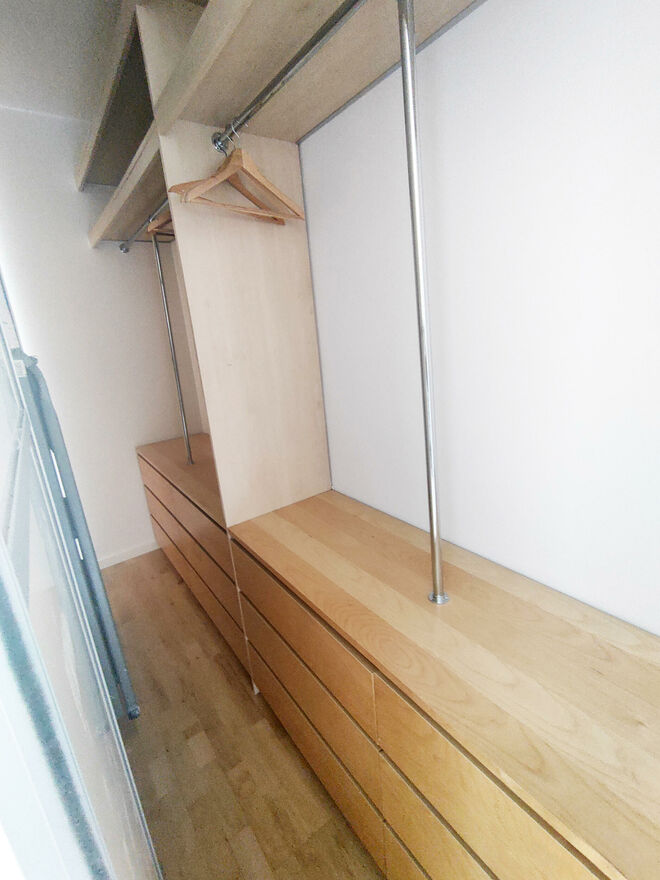 Podłogi wyłożone są panelami z drewna, a ściany pokryte gładzią gipsową, co nadaje przestrzeni elegancki i nowoczesny wygląd.