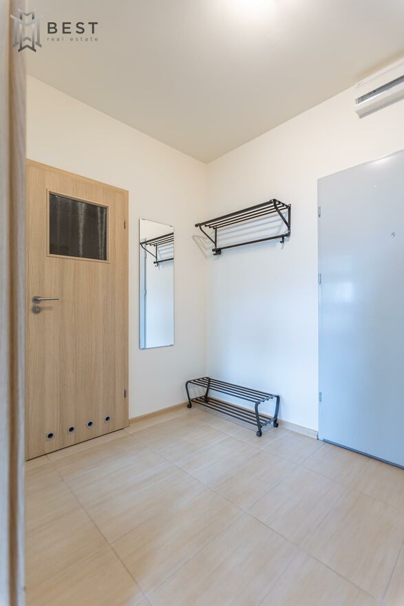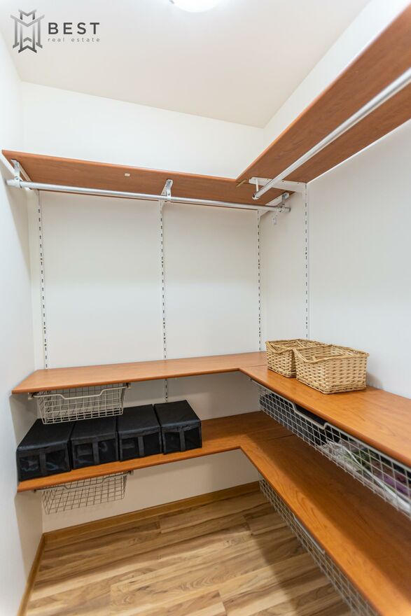 W mieszkaniu znajduje się również oddzielna garderoba z półkami, koszami oraz wieszakami. W przedpokoju szafka i stojak na buty, lustro oraz wieszak na ubrania.