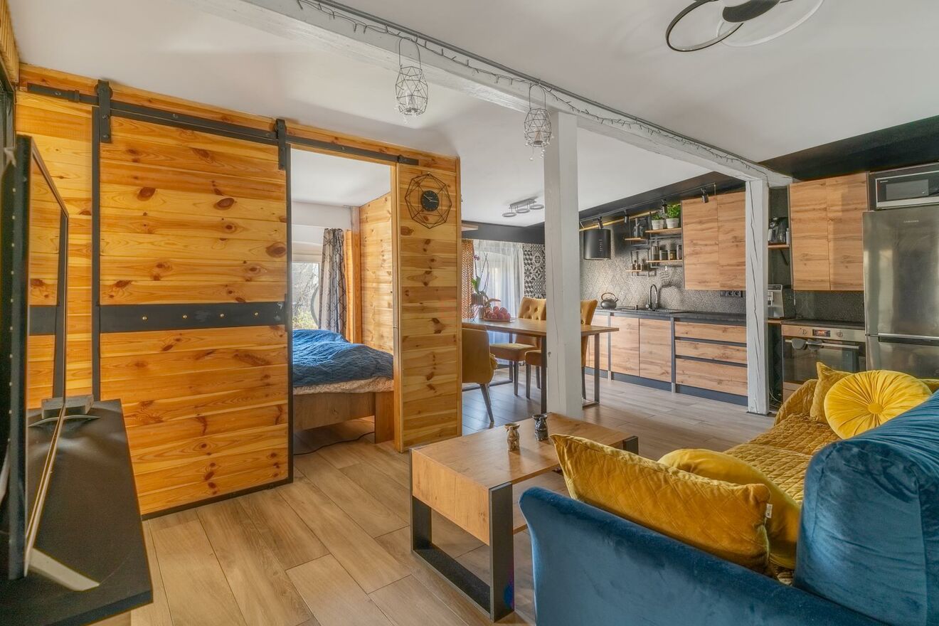 Przestronny salon z aneksem kuchennym. Trzy sypialnie (jedna wydzielona z salonu na drewnianym stelażu - możliwość adaptacji na garderobę lub powiększenie salonu). Łazienka z WC. Przedpokój.