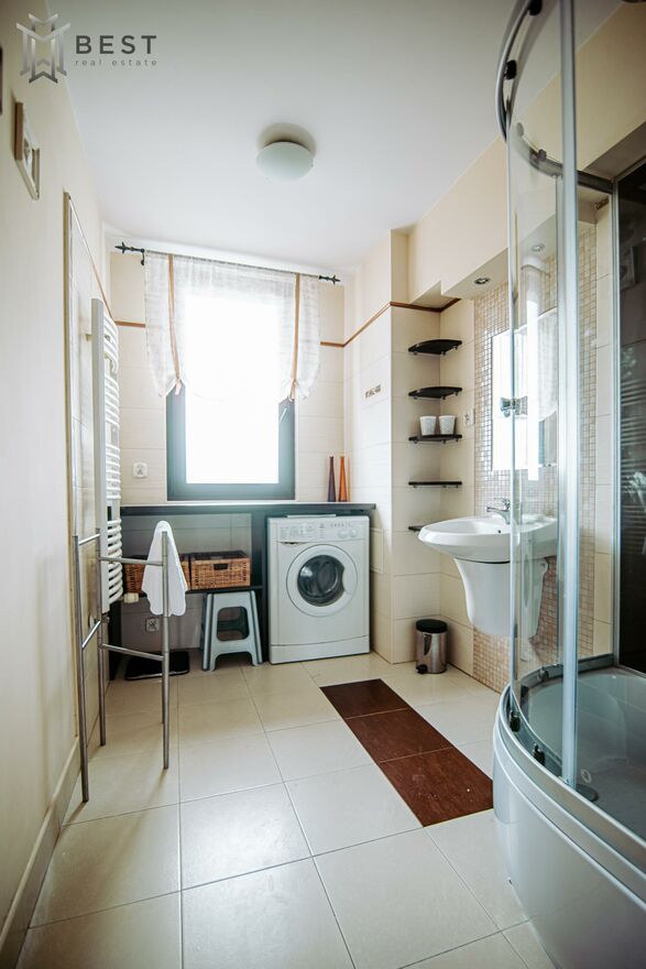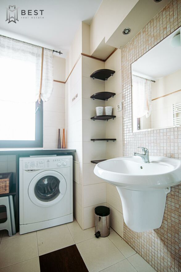 Dodatkowo mieszkanie wyposażone w m.in. w deskę do prasowania, żelazko, suszarkę na pranie, odkurzacz.