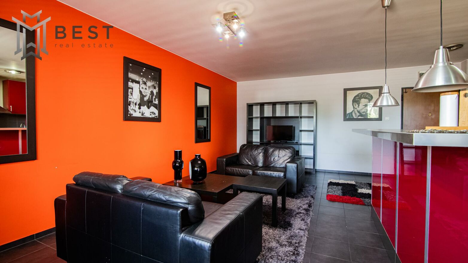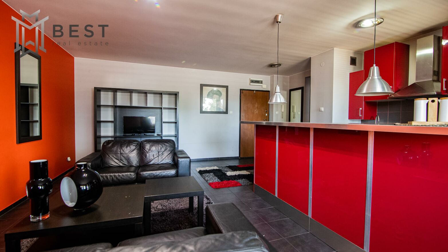 Lokal w pełni wyposażony i umeblowany. W pokoju dziennym kanapy skórzane, stoliki, regał, telewizor, biurko.