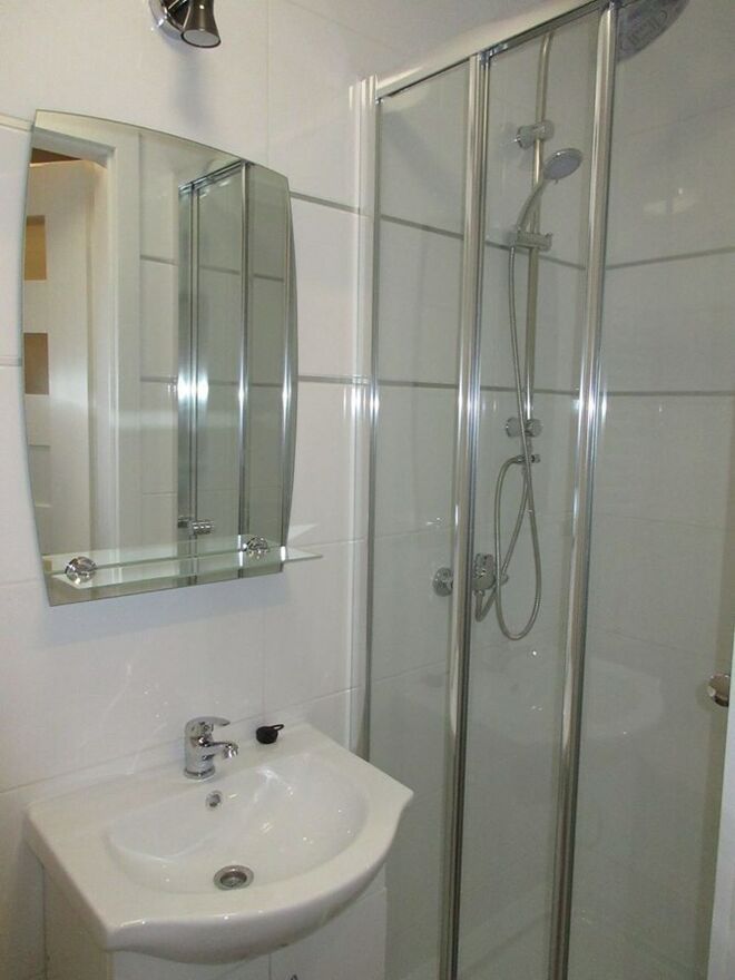 Łazienka: WC, kabina prysznicowa, umywalka.