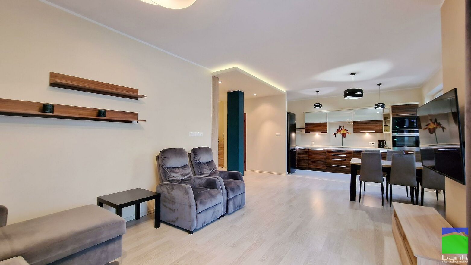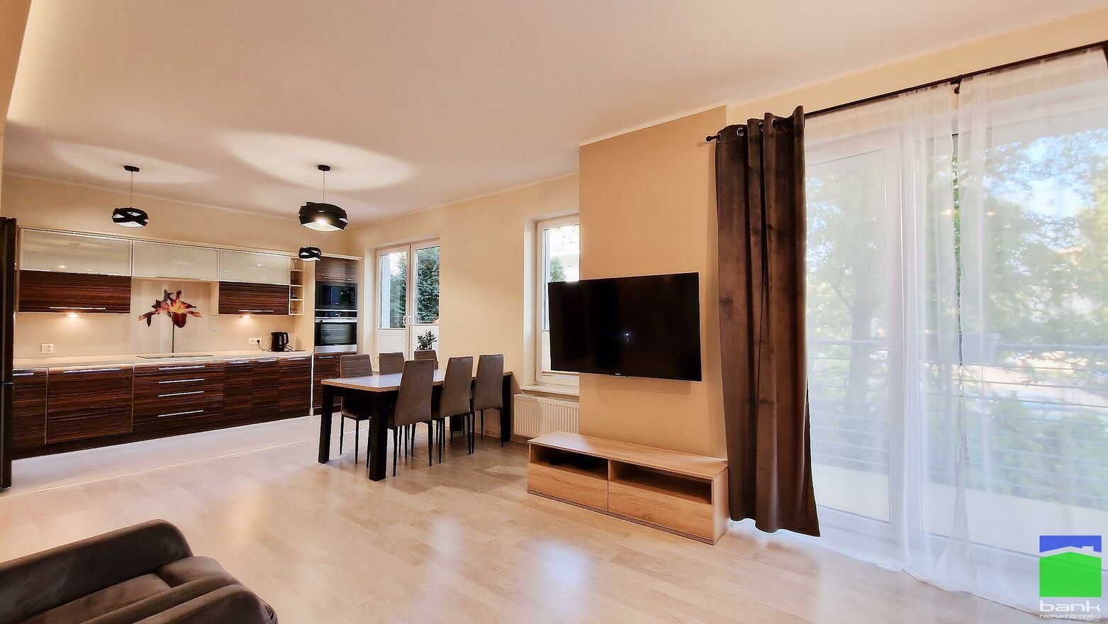 Przestronny salon z aneksem kuchennym, dwa niezależne pokoje z szafami w zabudowie.