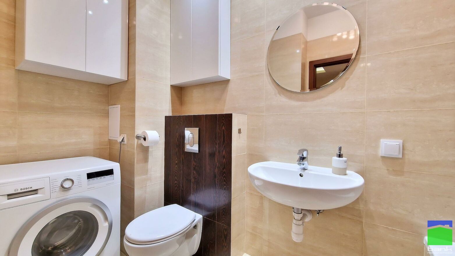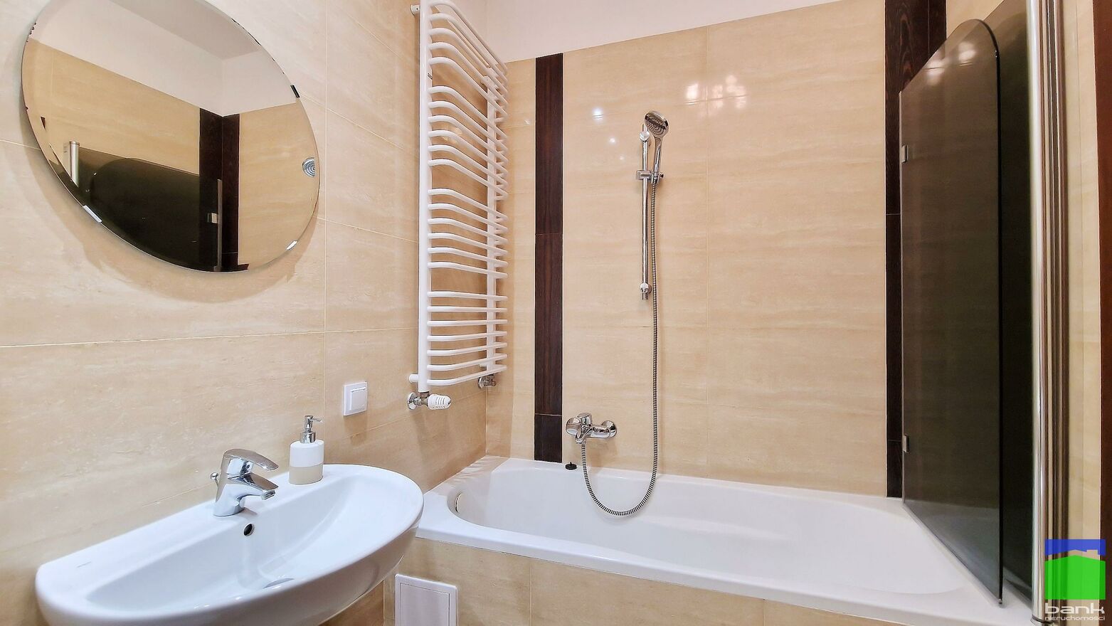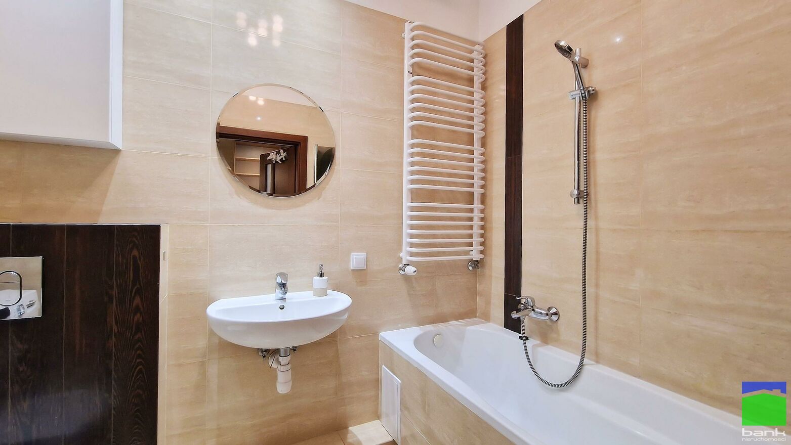 Łazienka z wanną i pralką. W przedpokoju szafa w zabudowie a także regał na książki.