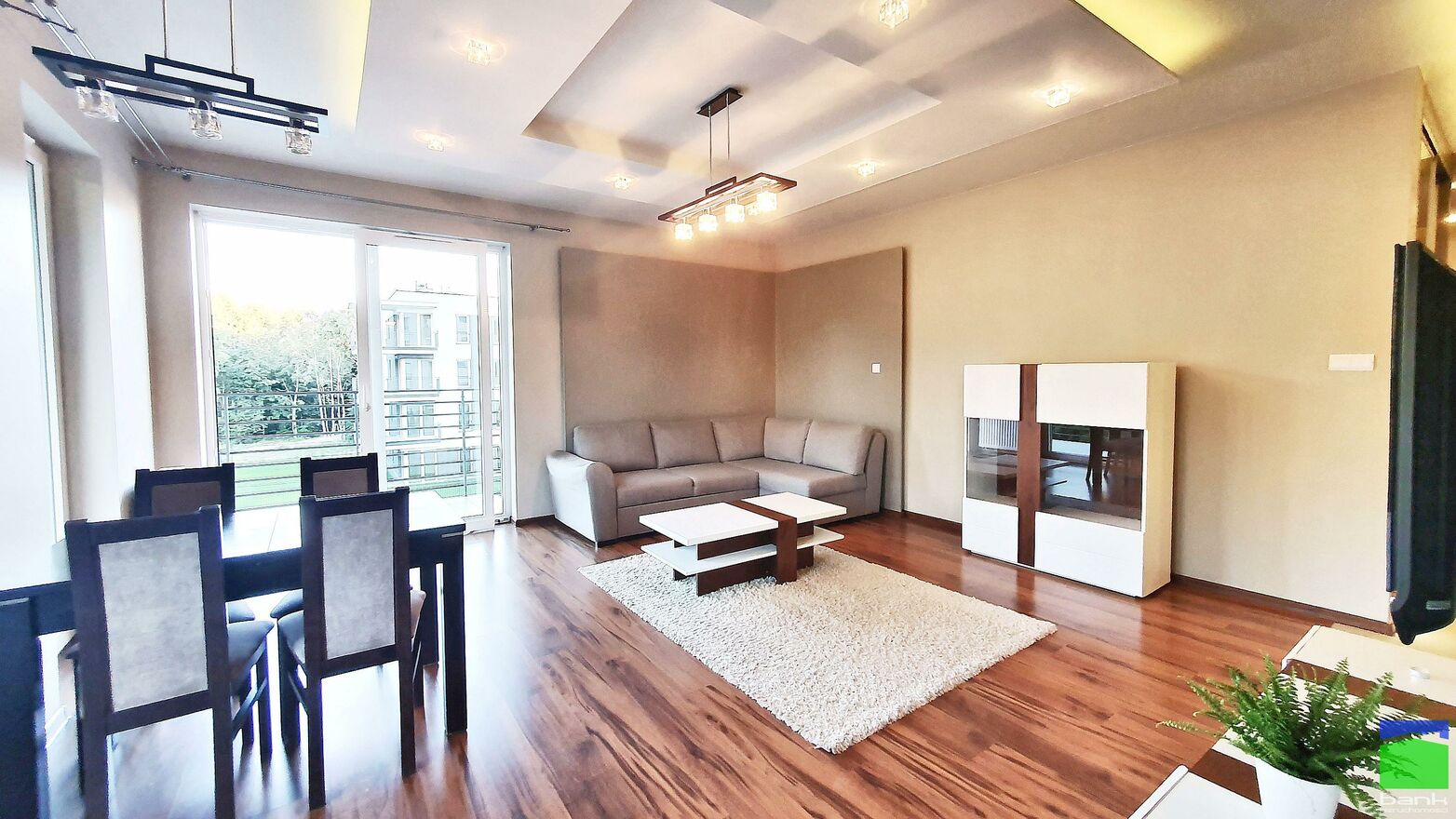 Przestronny salon z aneksem kuchennym, dwa niezależne pokoje.